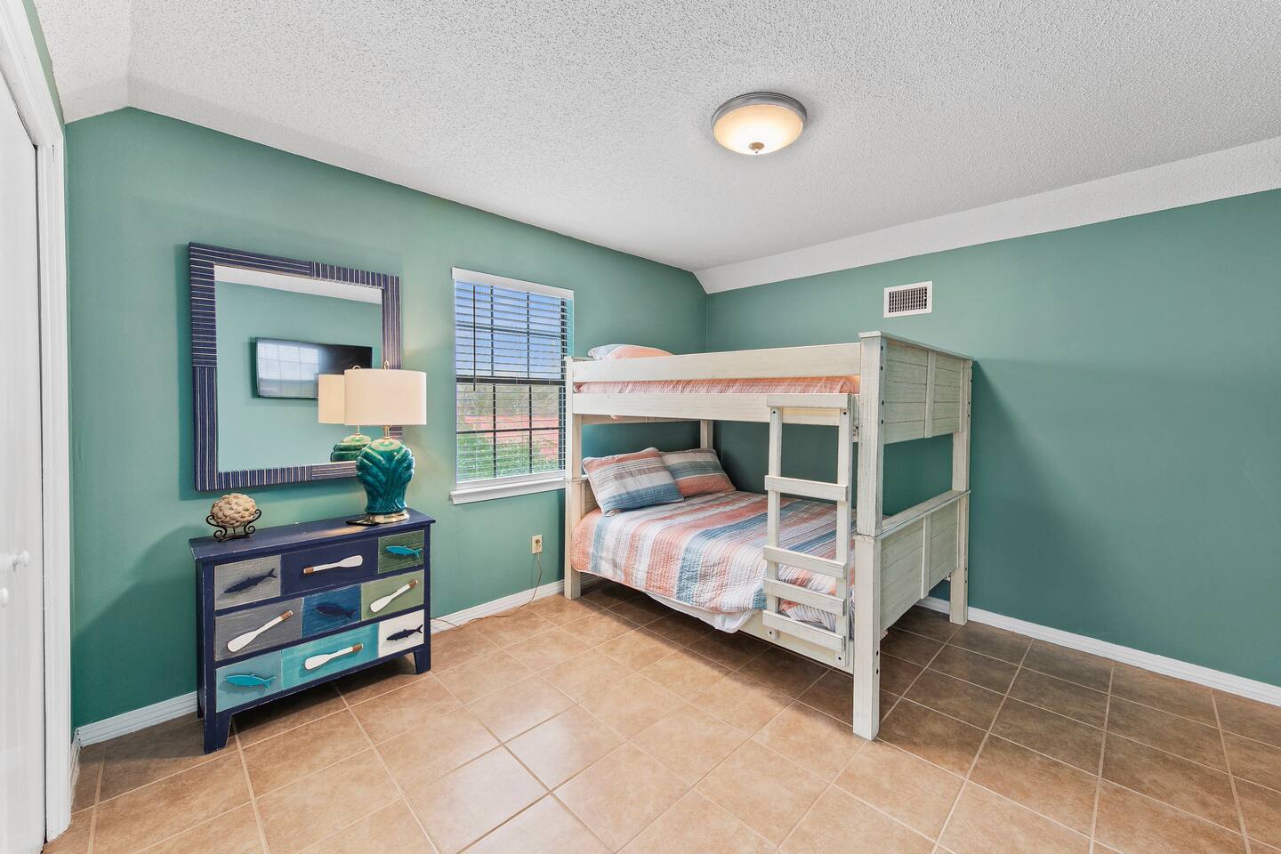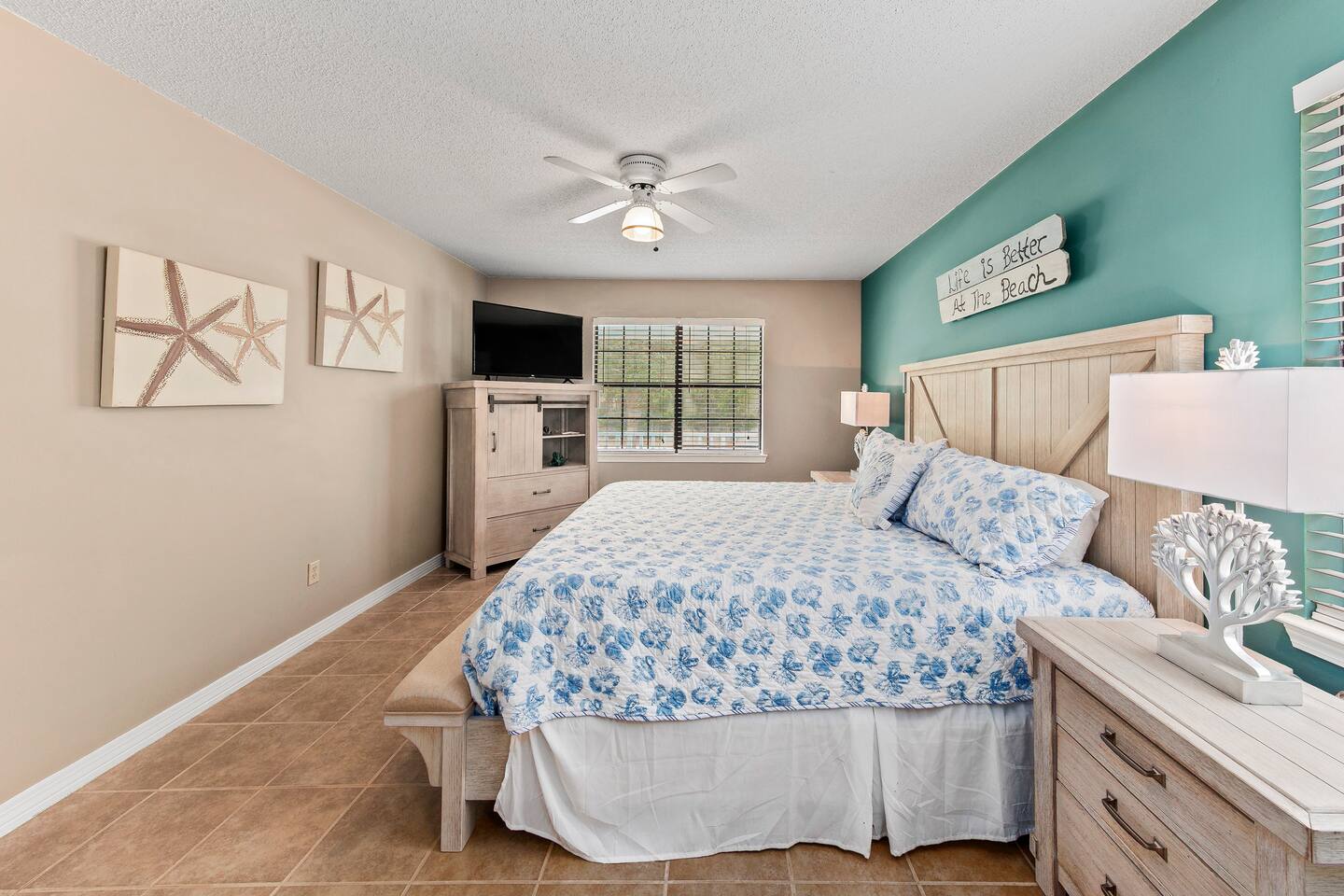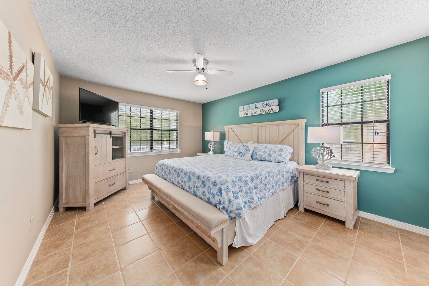 Downstairs master with King Bed. Two bedrooms upstairs, one Queen and two bunks. Kitchen, laundry, and living area downstairs.