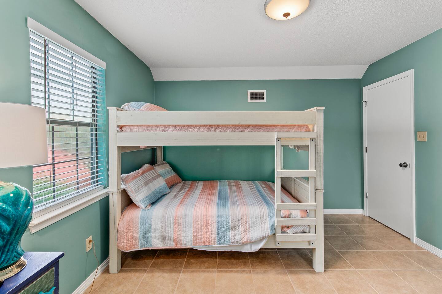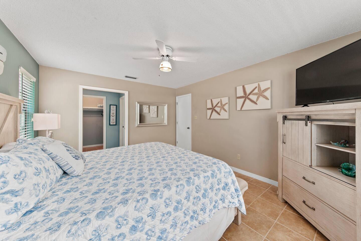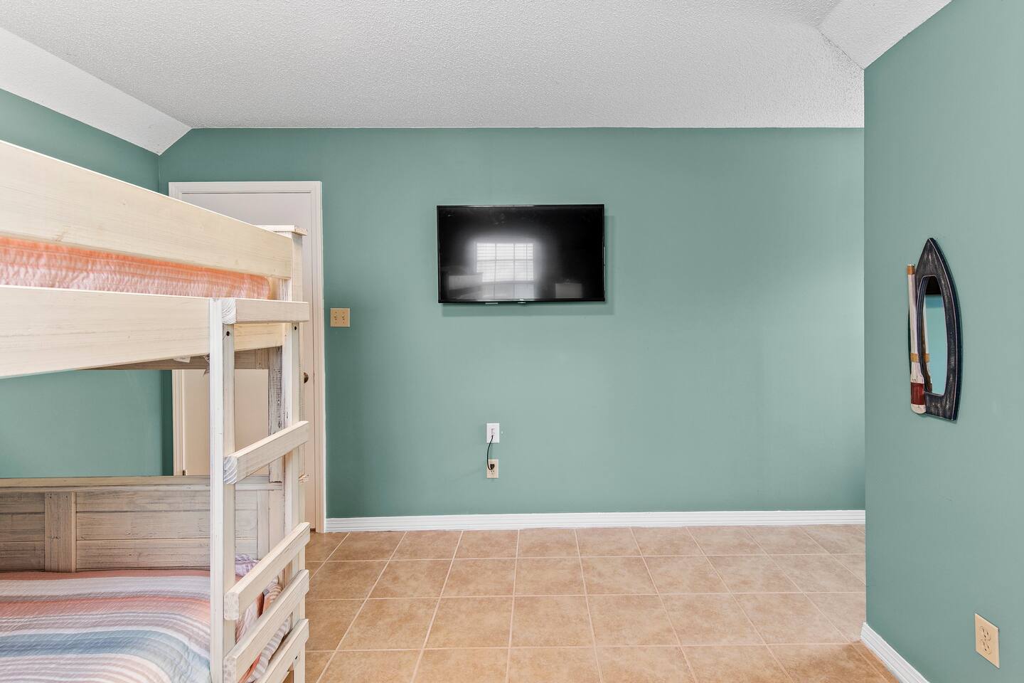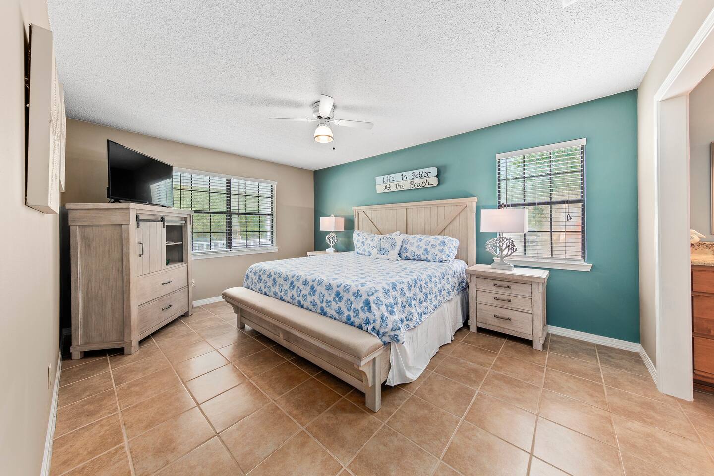 Downstairs master with King Bed. Two bedrooms upstairs, one Queen and two bunks. Kitchen, laundry, and living area downstairs.
