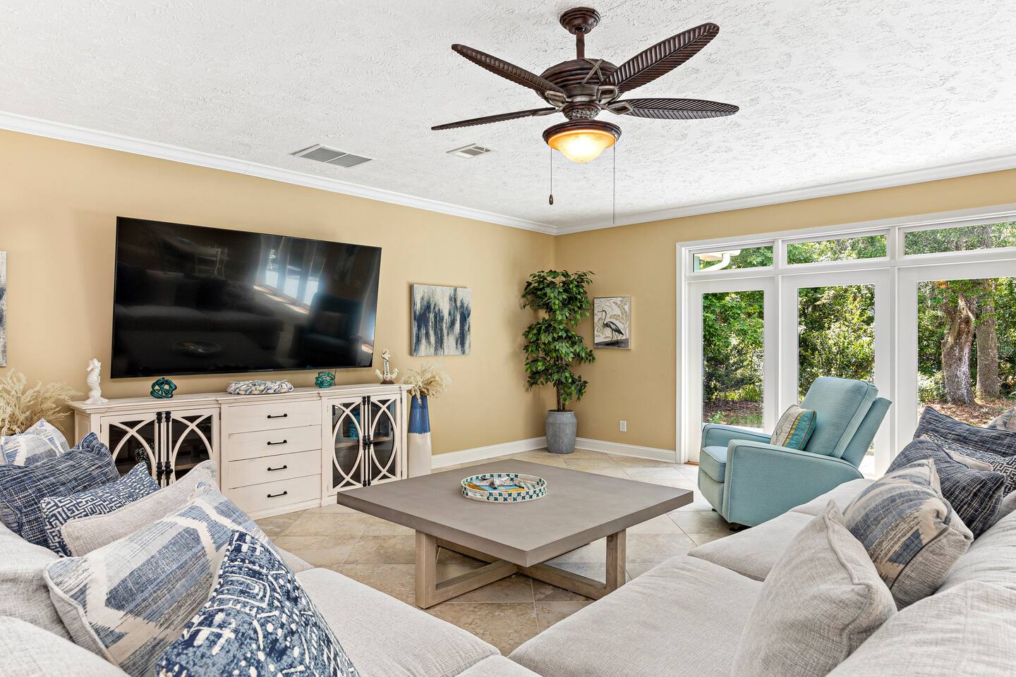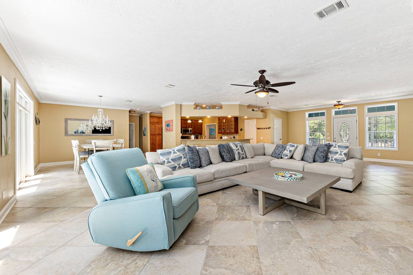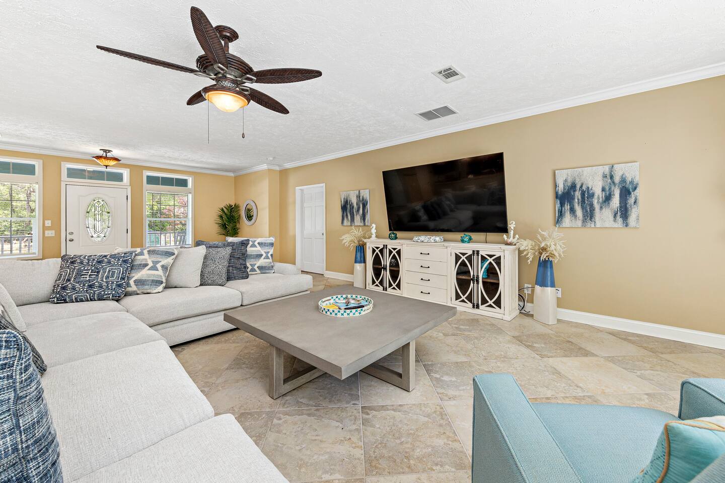 - Perfect for families. - Pet Friendly with large backyard. - Pet friendly beach a short drive away. - Close to Bon Secour hiking trails. - Close to world class Golf Courses. - Fishing pier within walking distance. - Small, community beach on the Bay. - Large, private backyard. - 85" TV in living area. - Pet walking trails. - Fully equipped kitchen (food items not provided). - Very large master bedroom. - Dedicated office space with built-in desk. - Low-density RV park on the Bay.